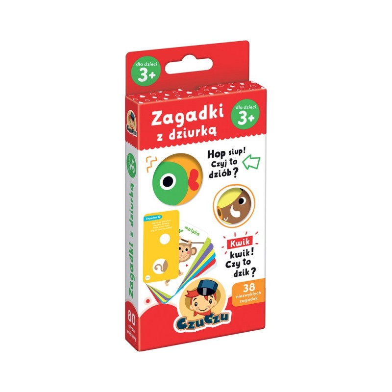Hop siup! Czyj to dziób? Dzieci uwielbiają zagadki! W edukacyjnej książeczce obrazkowej znajdziecie 38 rymowanych zagadek i odpowiedzi. Aby zabawa była jeszcze ciekawsza, ich ilustrowane fragmenty są widoczne przez specjalne dziurki. Dostosowane do wieku, pomysłowe zadania poruszają tematy bliskie maluchom. Książeczka na śrubie ma 80 stron i poręczny format. • książeczka na śrubie • liczba stron: 80 • pudełko o wymiarach 9 x 19,5 x 2,3 cm • odpowiednie dla dzieci w wieku 3+ • ilustracje i forma są dostosowane do wieku dziecka • zabawa rozwija spostrzegawczość, koncentrację i logiczne myślenie Przepis na dobrą zabawę Czas na zgadywanie! Przeczytaj wierszyk, a potem wspólnie zastanówcie się nad rozwiązaniem zagadki. Pomoże wam w tym fragment odpowiedzi widoczny przez dziurki. Czy mieliście rację? Razem sprawdźcie odpowiedź na następnej stronie. Gdy wszystkie zagadki będą już dobrze znane, możesz pytać o inne elementy obrazków.