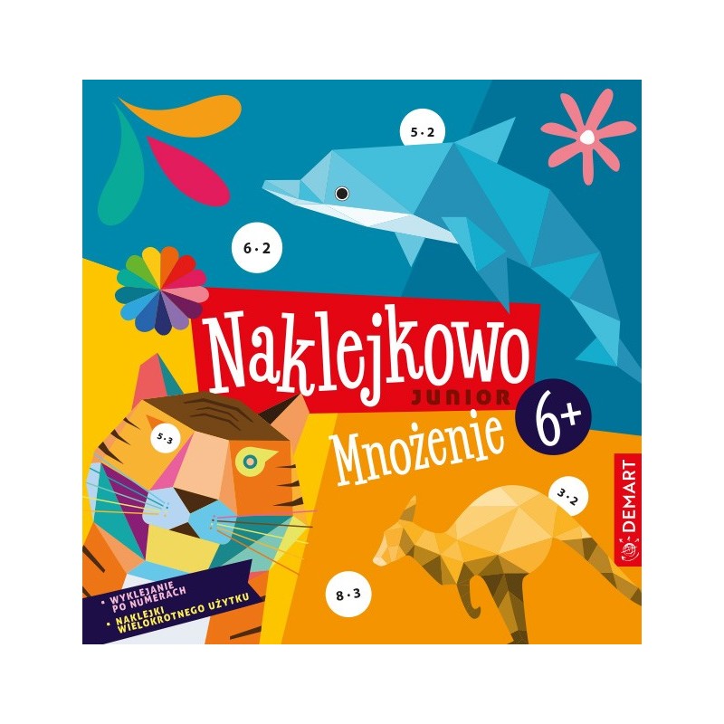 `Naklejkowo Junior 6+. Mnożenie` to najnowsza propozycja wydawnictwa Demart dla dzieci w wieku wczesnoszkolnym. Dzieci samodzielnie tworzą przepiękne, kolorowe grafiki nawiązujące do tematyki podróżowania, wyklejając obrazki po numerach i wynikach mnożenia. Materiał został opracowany zgodnie z zasadą stopniowania trudności: od mnożenia przez 1 po mnożenie przez 10. Dodatkowo na odwrocie każdej karty znajdują się zabawy i łamigłówki trenujące mnożenie. Każdą kartę do wyklejania można oderwać wzdłuż linii perforacji. Dzięki temu dziecku pracuje się wygodniej. Wyklejanie obrazków po wynikach mnożenia to nie tylko świetna zabawa, ale też doskonała okazja do rozwoju motoryki małej, doskonalenia koordynacji wzrokowo-ruchowej i trenowania skupienia.