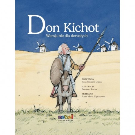 Don Kichot, szlachcic z hiszpańskiej wioski uważany przez rodzinę i sąsiadów za niespełna rozumu, wyrusza z giermkiem Sancho Pansą w pełną przygód i niebezpieczeństw podróż, której celami są pomoc bezbronnym, zdobycie serca pięknej damy Dulcynei z Toboso oraz przywrócenie złotej epoki błędnych rycerzy. Bohaterowie będą musieli stawić czoła olbrzymom, czarodziejom, balwierzom i innym rycerzom, spotkają na swojej drodze piękne damy, książęta i księżne, przemierzą dalekie krainy, odwiedzą gospody i zamki. Czy Don Kichot zwycięży przeciwników w kolejnych potyczkach? Czy odnajdzie swoją Dulcyneę? Czy uda mu się przywrócić czas szlachetnych rycerzy? Don Kichot to opowieść o odwadze, waleczności i przyjaźni, a nadto podręcznik sztuki marzenia. Powieść traktująca o skarbach, jakie nasza wyobraźnia może znaleźć w czytanych przez nas książkach, i mówiąca o niebezpieczeństwach związanych z nazbyt żarliwą lekturą ulubionych historii. Pozwól, by błędny rycerz i Ciebie zabrał w ekscytującą podróż po meandrach wyobraźni. Ta pełna uroku i wierna oryginałowi adaptacja opracowana przez profesor Rosę Navarro Durán skierowana jest do młodych czytelniczek i czytelników. Pozwoli im zapoznać się z klasycznym dziełem literatury hiszpańskiej i światowej, utworem, od którego zaczyna się historia europejskiej powieści. Informacje o autorce: Rosa Navarro Durán jest filolożką, profesorką literatury hiszpańskiej na Uniwersytecie w Barcelonie. Zasiadała w jury ważnych hiszpańskich nagród literackich (Premio Príncipe de Asturias de las Letras, 2000–2014, Premio Princesa de Asturias de las Letras, 2015-2016, 2019-2020, Premio Miguel de Cervantes, 2012). Jest autorką m.in. cenionych i popularnych adaptacji klasycznych dzieł literatury powszechnej kierowanych do dzieci i młodzieży. Spośród nich Wydawnictwo No Bell – w serii Klasyka literatury nie dla dorosłych – opublikuje również Iliadę, Odyseję i Eneidę. Informacje o ilustratorze: Francesc Rovira studiował w Escuela de Artes y Oficios de Barcelona [Szkole Sztuki i Rzemiosła w Barcelonie]. Zilustrował dziesiątki utworów, jego prace pojawiały się w książkach, czasopismach i gazetach. Miał wystawy indywidualne i zbiorowe, został uhonorowany m.in. prestiżowymi nagrodami CCEI (2003, 2004, w 2016 roku jego nazwisko umieszczono na Liście Honorowej CCEI) oraz Premio Sant Joan de Déu (2003).
