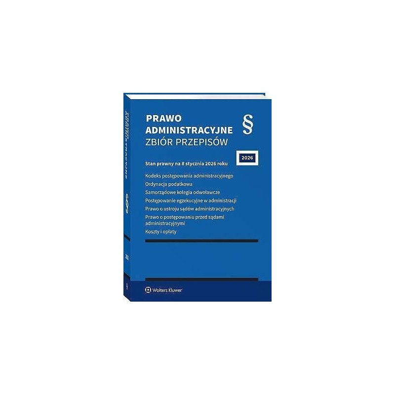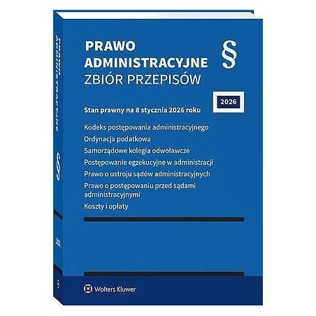 Praktyczny zbiór najważniejszych aktów prawnych z zakresu prawa administracyjnego. Zawiera informacje o uwzględnionych zmianach. Zastosowany system oznaczania nowych przepisów znacznie ułatwia codzienną pracę prawnika. Skorowidze do ustaw i tytuliki towarzyszące poszczególnym artykułom, poręczny format, miękka oprawa ze skrzydełkami mogącymi posłużyć za zakładki to dodatkowe atuty książki.UWZGLĘDNIA ZMIANY WCHODZĄCE W ŻYCIE Z DNIEM:KODEKS POSTĘPOWANIA ADMINISTRACYJNEGO3 grudnia 2025 r. – obwieszczenie Marszałka Sejmu Rzeczypospolitej Polskiej z 7 listopada 2025 r. w sprawie ogłoszenia jednolitego tekstu ustawy – Kodeks postępowania administracyjnego (Dz.U. poz. 1691)ORDYNACJA PODATKOWA:4 listopada 2025 r. – ustawa z 12 września 2025 r. o zmianie ustawy – Ordynacja podatkowa (Dz.U. poz. 1414)4 listopada 2025 r. – ustawa z 12 września 2025 r. o zmianie ustawy – Ordynacja podatkowa (Dz.U. poz. 1417)1 stycznia 2026 r. – ustawa z 21 listopada 2025 r. o zmianie ustawy o podatku od wydobycia niektórych kopalin oraz niektórych innych ustaw (Dz.U. poz. 1804)1 stycznia 2026 r. – obwieszczenie Ministra Finansów i Gospodarki z 7 sierpnia 2025 r. w sprawie wysokości kwoty wymienionej w art. 41 § 1 ustawy – Ordynacja podatkowa na rok 2026 r. (M.P. poz. 745)1 stycznia 2026 r. – obwieszczenie Ministra Finansów i Gospodarki z 13 sierpnia 2025 r. w sprawie wysokości kwoty wymienionej w art. 262 § 1 ustawy – Ordynacja podatkowa na rok 2026 r. (M.P. poz. 761)13 stycznia 2026 r. – ustawa z 21 listopada 2025 r. o zmianie ustawy o systemie zarządzania emisjami gazów cieplarnianych i innych substancji oraz niektórych innych ustaw (Dz.U. poz. 1863)1 lutego, 1 kwietnia 2026 r. – ustawa z 16 czerwca 2023 r. o zmianie ustawy o podatku od towarów i usług oraz niektórych innych ustaw (Dz.U. poz. 1598 ze zm.)12 lipca 2026 r. – ustawa z 5 sierpnia 2025 r. o certyfikacji wykonawców zamówień publicznych (Dz.U. poz. 1235)2 kwietnia 2027 r. – ustawa z 17 października 2025 r. o zmianie ustawy o ochronie praw nabywcy lokalu mieszkalnego lub domu jednorodzinnego oraz Deweloperskim Funduszu Gwarancyjnym oraz niektórych innych ustaw (Dz.U. poz. 1669)POSTĘPOWANIE EGZEKUCYJNE W ADMINISTRACJI:30 września 2025 r. – ustawa z 12 września 2025 r. o bonie ciepłowniczym oraz o zmianie niektórych ustaw w celu ograniczenia wysokości cen energii elektrycznej (Dz.U. poz. 1302)PRAWO O POSTĘPOWANIU PRZED SĄDAMI ADMINISTRACYJNYMI:5 listopada 2025 r. – ustawa z 12 września 2025 r. o zmianie ustawy – Prawo o postępowaniu przed sądami administracyjnymi (Dz.U. poz. 1427)1 marca 2026 r. – ustawa z 4 grudnia 2025 r. o zmianie ustawy o doradztwie podatkowym oraz ustawy – Prawo o postępowaniu przed sądami administracyjnymi (Dz.U. poz. 1882)1 października 2029 r. – ustawa z 18 listopada 2020 r. o doręczeniach elektronicznych (Dz.U. z 2026 r. poz. 3)1 października 2029 r. – ustawa z 7 lipca 2023 r. o zmianie ustawy – Kodeks postępowania cywilnego, ustawy – Prawo o ustroju sądów powszechnych, ustawy – Kodeks postępowania karnego oraz niektórych innych ustaw (Dz.U. poz. 1860)OPŁATY ZA CZYNNOŚCI ADWOKACKIE:1 stycznia 2026 r. – rozporządzenie Ministra Sprawiedliwości z 24 września 2025 r. zmieniające rozporządzenie w sprawie opłat za czynności adwokackie (Dz.U. poz. 1314)OPŁATY ZA CZYNNOŚCI RADCÓW PRAWNYCH:1 stycznia 2026 r. – rozporządzenie Ministra Sprawiedliwości z 24 września 2025 r. zmieniające rozporządzenie w sprawie opłat za czynności radców prawnych (Dz.U. poz. 1336)
