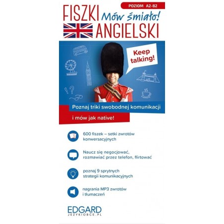 Fiszki. Mów śmiało! Angielski to komplet 600 fiszek do nauki angielskiego ze zwrotami komunikacyjnymi na poziomie średnio zaawansowanym (poziom A2-B2), wysokiej jakości nagraniami wymowy oraz programem multimedialnym z ćwiczeniami i grami językowymi. To innowacyjny kurs konwersacji, który łączy naukę z fiszek z interaktywnym treningiem!Ucz się z fiszkami przykładowych zdań oraz wzorców komunikacyjnych i mów śmiało! Ćwicz wyrażanie emocji, podążanie za wypowiedzią i prezentację własnego zdania. Poznaj sprytne strategie konwersacyjne jak powtórzenie czy prośbę o wyjaśnienie. Dowiedź się w jaki sposób udzielać rad, wyrażać opinie lub jak podtrzymywać rozmowę.Ćwicz prawidłową wymowę słuchając nagrań profesjonalnego lektora i baw się językiem grając w gry językowe i rozwiązując różnorodne zadania w programie multimedialnym Aktywny Trening. Korzystaj z kolorowych przegródek: uczę się/powtarzam/umiem i rób szybkie powtórki za pomocą dołączonej memolisty. Twórz własne playlisty nagrań wymowy, ucz się mobilnie oraz zabieraj fiszki gdzie tylko chcesz.Fiszki. Mów śmiało! Angielski to:600 fiszek ze zwrotami konwersacyjnymi i celami komunikacyjnymiponad 20 przydatnych kategorii m.in. rozmowa u lekarza, negocjacje biznesowe i domowekolorowe przegródki – sprawdzona metoda naukiprogram Aktywny Treningnagrania mp3 do pobraniapoziom średniozaawansowany (A2-B2)
