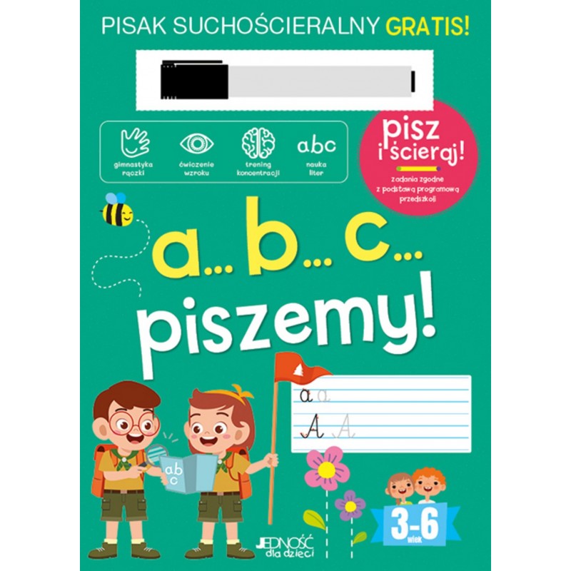 Książka A...B...C... piszemy! powstała z myślą o dzieciach, które zaczynają poznawać litery i uczą się pisać. Odpowiednio przygotowane strony oraz dołączony do książki pisak umożliwiają dziecku opanowanie tych umiejętności. Maluch może ćwiczyć pisanie liter i rozwiązywanie zadań pisakiem suchościeralnym, po czym w każdej chwili zetrzeć jego ślad, aby coś poprawić czy napisać staranniej. Ciekawe i zabawne zadania oraz wesołe rysunki z pewnością zachęcą dziecko do powtórzenia ćwiczeń – i to wiele razy!
