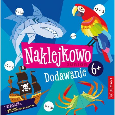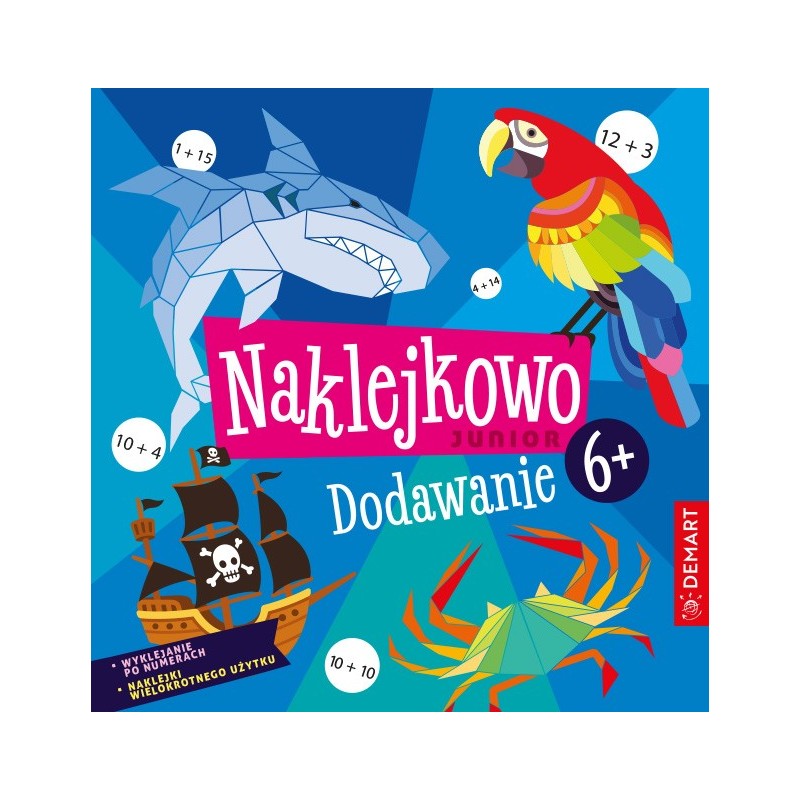 `Naklejkowo Junior 6+. Dodawanie` to najnowsza propozycja wydawnictwa Demart dla dzieci w wieku wczesnoszkolnym. Dzieci samodzielnie tworzą przepiękne, kolorowe grafiki nawiązujące do świata piratek i piratów, wyklejając obrazki po numerach i wynikach dodawania. Materiał został opracowany zgodnie z zasadą stopniowania trudności: od najprostszych działań w obrębie 10, po trudniejsze, z przekroczeniem progu dzisiątkowego w zakresie 20. Dodatkowo na odwrocie każdej karty znajdują się zabawy i łamigłówki trenujące dodawanie. Każdą kartę do wyklejania można oderwać wzdłuż linii perforacji. Dzięki temu dziecku pracuje się wygodniej. Wyklejanie obrazków po wynikach dodawania to nie tylko świetna zabawa, ale też doskonała okazja do rozwoju motoryki małej, doskonalenia koordynacji wzrokowo-ruchowej i trenowania skupienia.