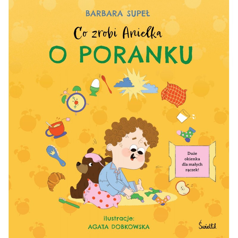 Książka o codziennych rytuałach dla maluszków– do wspólnego odkrywania świata! „,Co zrobi Anielka“, to seria książek z okienkami skierowana do najmłodszych, autorstwa Barbary Supeł i zilustrowana przez Agatę Dobkowską– duetu znanego z bestsellerowej serii „,Co zrobi Frania?“,. Główną bohaterką nowego cyklu jest Anielka, młodsza siostra Frani, która zaprasza swoich rówieśników do wspólnego odkrywania rutyny codzienności! W tomie „,Co zrobi Anielka o poranku“, dziewczynka pokazuje, jak rozpoczyna swój dzień–co je na śniadanie, jak myje zęby, w co się ubierze. Porannym decyzjom towarzyszą drobne rytuały, tak dobrze znane każdemu maluchowi. Sztywne kartonowe strony z zaokrąglonymi rogami, wytrzymałe na dziecięce rączki, kryją ponad 30 okienek, które urozmaicają lekturę, wspierają rozwój manualny oraz rozbudzają ciekawość i wyobraźnię dziecka. Kolorowe ilustracje zachęcają najmłodszych do lektury, a przyjazna treść świetnie sprawdzi się podczas wspólnego czytania. Co zrobi Anielka o poranku? Otwórz okienko i się przekonaj!