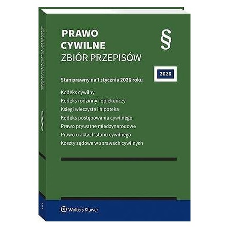 Praktyczny zbiór najważniejszych aktów prawnych z zakresu prawa cywilnego. Zawiera informacje o uwzględnionych zmianach. Zastosowany system oznaczania nowych przepisów znacznie ułatwia codzienną pracę prawnika. Skorowidze do ustaw i tytuliki towarzyszące poszczególnym artykułom, poręczny format, użyteczne registry, miękka oprawa ze skrzydełkami mogącymi posłużyć za zakładki to dodatkowe atuty książki.UWZGLĘDNIA ZMIANY WCHODZĄCE W ŻYCIE Z DNIEM:KODEKS CYWILNY13 lipca 2025 r. – ustawa z 21 maja 2025 r. o zmianie niektórych ustaw w celu deregulacji prawa gospodarczego i administracyjnego oraz doskonalenia zasad opracowywania prawa gospodarczego (Dz.U. poz. 769)6 sierpnia 2025 r. – obwieszczenie Marszałka Sejmu Rzeczypospolitej Polskiej z 25 lipca 2025 r. w sprawie ogłoszenia jednolitego tekstu ustawy – Kodeks cywilny (Dz.U. poz. 1071)27 listopada 2025 r. – ustawa z 5 sierpnia 2025 r. o zmianie ustawy – Kodeks postępowania cywilnego, ustawy – Kodeks cywilny oraz niektórych innych ustaw (Dz.U. poz. 1172)4 grudnia 2025 r. – ustawa z 9 października 2025 r. o zmianie ustawy – Kodeks cywilny (Dz.U. poz. 1508)po upływie 30 dni od dnia ogłoszenia – ustawa z 4 grudnia 2025 r. o zmianie ustawy – Kodeks cywilny, ustawy o ubezpieczeniach obowiązkowych, Ubezpieczeniowym Funduszu Gwarancyjnym i Polskim Biurze Ubezpieczycieli Komunikacyjnych oraz ustawy o działalności ubezpieczeniowej i reasekuracyjnej (druk sejm. nr 1797, oczekuje na podpis Prezydenta RP)KODEKS RODZINNY I OPIEKUŃCZY8 października 2025 r. – ustawa z 24 czerwca 2025 r. o zmianie ustawy – Kodeks rodzinny i opiekuńczy (Dz.U. poz. 897)KSIĘGI WIECZYSTE I HIPOTEKA17 marca 2026 r. – ustawa z 21 listopada 2025 r. o zmianie ustawy – Prawo o notariacie oraz ustawy o księgach wieczystych i hipotece (Dz.U. poz. 1793)2 kwietnia 2027 r. – ustawa z 17 października 2025 r. o zmianie ustawy o ochronie praw nabywcy lokalu mieszkalnego lub domu jednorodzinnego oraz Deweloperskim Funduszu Gwarancyjnym oraz niektórych innych ustaw (Dz.U. poz. 1669)17 czerwca 2027 r. – ustawa z 21 listopada 2025 r. o zmianie ustawy o statystyce publicznej oraz niektórych innych ustaw (Dz.U. poz. 1792)KODEKS POSTĘPOWANIA CYWILNEGO1 czerwca 2025 r. – ustawa z 20 marca 2025 r. o rynku pracy i służbach zatrudnienia (Dz.U. poz. 620)10 września 2025 r., 1 marca 2026 r., 1 czerwca 2026 r., 1 marca 2027 r. – ustawa z 5 sierpnia 2025 r. o zmianie ustawy – Kodeks postępowania cywilnego, ustawy – Kodeks cywilny oraz niektórych innych ustaw (Dz.U. poz. 1172)30 września 2025 r. – ustawa z 12 września 2025 r. o bonie ciepłowniczym oraz o zmianie niektórych ustaw w celu ograniczenia wysokości cen energii elektrycznej (Dz.U. poz. 1302)5 grudnia 2025 r., 5 lutego 2026 r. – ustawa z 9 października 2025 r. o zmianie ustawy – Kodeks postępowania cywilnego (Dz.U. poz. 1518)13 grudnia 2025 r. – ustawa z 5 listopada 2025 r. o układach zbiorowych pracy i porozumieniach zbiorowych (Dz.U. poz. 1661)18 kwietnia 2026 r. – ustawa z 5 sierpnia 2015 r. o zmianie ustawy o ochronie konkurencji i konsumentów oraz niektórych innych ustaw (Dz.U. poz. 1634)po upływie 30 dni od dnia ogłoszenia – ustawa z 18 grudnia 2025 r. o zmianie ustawy o świadczeniu usług drogą elektroniczną oraz niektórych innych ustaw (druk sejm. nr 1757, oczekuje na podpis Prezydenta RP)po upływie 3 miesięcy od dnia ogłoszenia, 1 stycznia 2027 r. – ustawa z 18 grudnia 2025 r. o zmianie ustawy o systemie ubezpieczeń społecznych oraz niektórych innych ustaw (druk sejm. nr 1856, oczekuje na podpis Prezydenta RP)PRAWO O AKTACH STANU CYWILNEGO9 sierpnia 2025 r. – ustawa z 25 czerwca 2025 r. o zmianie ustawy o informatyzacji działalności podmiotów realizujących zadania publiczne oraz niektórych innych ustaw (Dz.U. poz. 1006)KOSZTY SĄDOWE W SPRAWACH CYWILNYCH13 lipca 2025 r. – ustawa z 21 maja 2025 r. o zmianie niektórych ustaw w celu deregulacji prawa gospodarczego i administracyjnego oraz doskonalenia zasad opracowywania prawa gospodarczego (Dz.U. poz. 769)8
