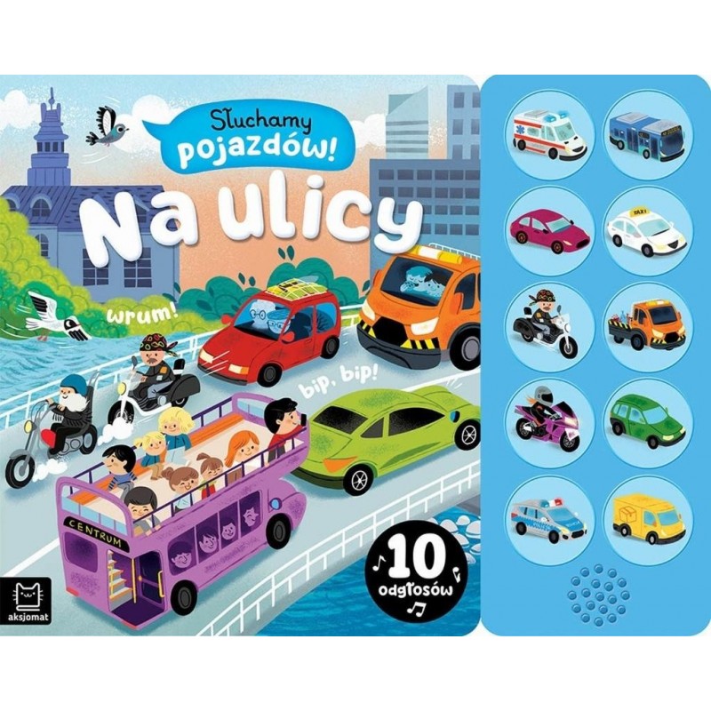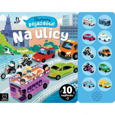 Zapraszamy maluchy na spotkanie z różnorodnymi pojazdami, których silniki: warczą, hamują, jadą i wydają inne ciekawe odgłosy. Wystarczy tylko włączyć przycisk na panelu dźwiękowym, by usłyszeć odgłosy aut i motocykli. Starannie przygotowane i przyjemne w odbiorze nagrania oraz piękne ilustracje rozwijają spostrzegawczość maluchów i zachęcają do poznawania pojazdów, które spotykamy na ulicy. Obrazki w książce zachęcają również do opowiadania, opisywania, wskazywania szczegółów i ich liczenia. Do książki dołączony jest panel dźwiękowy z głośniczkiem i przyciskami. Dzieci z łatwością uruchamiają realistyczne nagrania aut i motocykli. Tym samym uczą się samodzielności i rozwijają motorykę małą. Gdy nagrania już się znudzą, można zablokować ich odtwarzanie.
