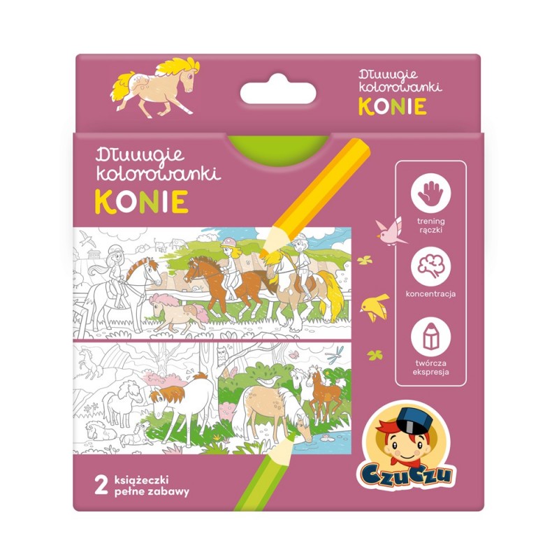 Kredki w dłoń, czas kontynuować przygodę z kolorowaniem. Konie i jeźdźcy ze słonecznej stadniny zapraszają do twórczej zabawy! Kreatywny zestaw zawiera 2 bardzo długie książeczki harmonijki z 2 panoramicznymi kolorowankami oraz mnóstwem kreatywnych i edukacyjnych zadań. • zestaw zawiera 2 książeczki harmonijki • opakowanie o wymiarach 18 x 20 x 0,5 cm • długość książeczki: 96 cm • odpowiednie dla dzieci w wieku 4+ • ilustracje i forma są dostosowane do wieku dziecka • zabawa rozwija małą motorykę, kreatywność i logiczne myślenie Przepis na dobrą zabawę Pełne humoru i zabawnych detali ilustracje z przyjaciółmi ze stadniny zachęcają do sięgania po kredki. Pozwólcie dzieciom na twórczą zabawę, dowolne łączenie kolorów, rysowanie z wyobraźni. Liczy się radość tworzenia. Pomóżcie, gdy potrzebują pomocy z rozwiązaniem zadania. Wykorzystajcie kolorowankę jako inspirację do poszerzania wiedzy na temat koni.