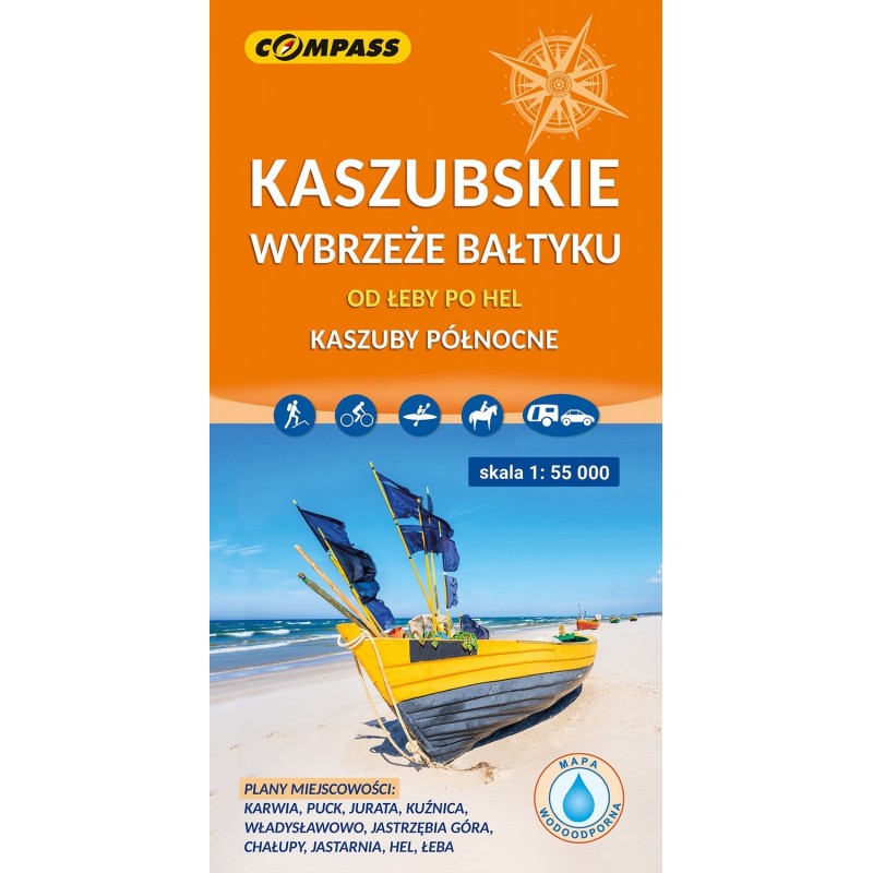 Mapa „Kaszubskie wybrzeże Bałtyku” w skali 1:55 000 to szczegółowe opracowanie niezwykle popularnego fragmentu polskiego wybrzeża – od Łeby aż po Hel, z południowym zasięgiem wyznaczonym przez Lębork i Gdynię. To idealne narzędzie zarówno dla turystów wypoczywających nad morzem, jak i dla osób planujących aktywne zwiedzanie. Co znajdziesz na mapie? - gęstą sieć szlaków pieszych, rowerowych i nordic walking, - przebieg międzynarodowych tras rowerowych EuroVelo 10 i 13, - numery wejść na plaże, - porty, przystanie białej floty, latarnie morskie, fortyfikacje nadmorskie, - lokalizację wraków zatopionych w Zatoce Puckiej, Gdańskiej i na Bałtyku, - wybraną bazę noclegową i gastronomiczną, - plany centrów miejscowości nadmorskich: Łeby, Karwi, Pucka, Juraty, Władysławowa, Jastrzębiej Góry, Chałup, Jastarni i Helu. Dzięki cieniowaniu rzeźby terenu mapa pozwala rozpoznać Pradolinę Redy i Łeby oraz formy polodowcowe – moreny czołowe i wydmy przedpola lodowca.