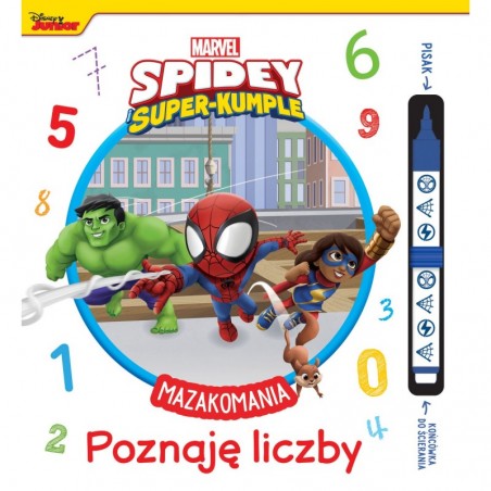 Ucz się rozpoznawać i pisać cyfry z suchościeralnym mazakiem W książce znajdują się zadania, dzięki którym dziecko poznaje cyfry od 1 do 9 i utrwala ich zapis. W środku mnóstwo aktywności do wykonania – labirynty, pisanie po śladzie, szlaczki i wiele więcej. Przy każdej z prezentowanych w książce cyfr są narysowane strzałki wskazujące na kolejność ruchów przy pisaniu – to duże ułatwienie, zwłaszcza na początku, kiedy dopiero uczymy się pisać. Każda cyfra jest wykropkowana, dzięki czemu można wodzić palcem po przerywanych liniach i pisać po nich flamastrem. Do książki dołączony jest suchościeralny mazak, który umożliwia wykonywanie tych samych ćwiczeń wielokrotnie. Zadania są osadzone w świecie Pajęczej Drużyny znanej z serialu animowanego Disney Junior – Spidey i super-kumple. Szukaj wskazówek, łap złoczyńców i wykonuj inne misje w towarzystwie superbohaterów. Rysuj, pisz i zmazuj, i pamiętaj, że trening czyni mistrza!