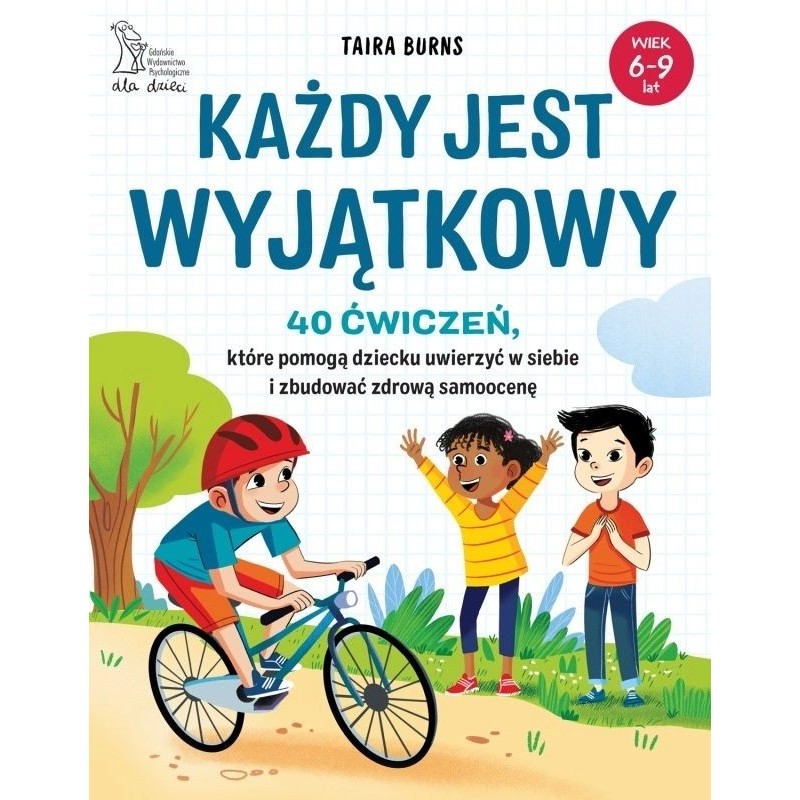 Na świecie żyją miliardy ludzi – i każdy jest inny od pozostałych. Pod niektórymi względami jesteśmy do siebie podobni, a pod innymi bardzo się od siebie różnimy. To właśnie ta różnorodność sprawia, że świat jest taki ciekawy, a każdy z nas jest wyjątkowy! Ty i twoje dziecko również. Niekiedy mamy gorszy dzień, czujemy się mniej pewnie, a może nawet nie za bardzo siebie lubimy. To jest zupełnie naturalne. Poznawanie siebie stanowi pierwszy krok do tego, by siebie polubić i zbudować zdrową samoocenę. Jak pomóc w tym dziecku? Choćby poprzez wspólną lekturę, rozmowę czy proponowanie najróżniejszych zajęć, dzięki którym dostrzeże ono swoje pozytywne cechy. „Każdy jest wyjątkowy” to praktyczny, ciepły i wspierający przewodnik dla dzieci w wieku 6–9 lat. Dzięki 40 prostym, angażującym ćwiczeniom dziecko odkryje, co czyni je niepowtarzalnym, nauczy się rozumieć swoje emocje, rozpoznawać mocne strony i radzić sobie w trudniejszych chwilach. Książka stanowi także idealną propozycję dla rodziców, nauczycieli i pedagogów, którzy chcą wspierać dzieci w rozwijaniu pewności siebie i samoakceptacji w przyjazny, mądry i dostosowany do ich wieku sposób. Dzięki pracy z tą książką dziecko: · wzmocni pewność siebie, · odkryje swoje talenty i mocne strony, · zrozumie, że nie musi być idealne, aby być wyjątkowe, · nauczy się lepiej rozpoznawać swoje uczucia, · będzie potrafiło odważnie mówić o tym, co myśli i czuje, · uwierzy w siebie TAIRA BURNS – pochodzi z okolic malowniczych gór Smoky Mountains w stanie Tennessee. Ukończyła studia licencjackie z psychologii, a magisterskie z poradnictwa klinicznego. Jako studentka pracowała z dziećmi z zaburzeniami ze spektrum autyzmu, a w pierwszych latach po studiach z nastolatkami, które weszły w konflikt z prawem, oraz ich rodzinami. Obecnie prowadzi prywatny gabinet terapeutyczny. Specjalizuje się w terapii dzieci i nastolatków zmagających się z lękiem, depresją i trudnościami adaptacyjnymi. Uwielbia spędzać wolny czas na łonie natury – pływać kajakiem, wędrować oraz kąpać się z mężem i trzema psami. Publikuje treści z zakresu zdrowia psychicznego w mediach społecznościowych. Na profilu TairaTalksTherapy dzieli się informacjami na temat lęku, wyznaczania granic i radzenia sobie z wyzwaniami szkolnymi.