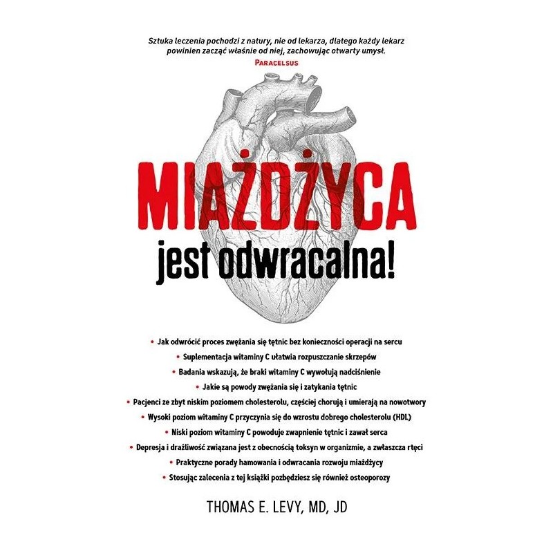 Obalenie mitu o miażdżycy! Istnieje przekonanie, że miażdżyca to choroba postępująca i niemożliwa do wyleczenia. Dr Thomas E. Levy przytacza liczne argumenty naukowe, które obalają ten mit. Ten znany popularyzator korzyści wynikających z suplementacji megadawkami witaminy C przystępnie tłumaczy mechanizm powstawania miażdżycy i choroby wieńcowej. Podkreśla, że osoby o najwyższym poziomie tego składnika odżywczego w tkankach cieszą się najniższą śmiertelnością. Dlaczego warto przeczytać tę książkę? Levy omawia też przyczyny niskiego poziomu witaminy C w wewnętrznych błonach tętnic. Są to m.in. codzienna ekspozycja na substancje toksyczne, palenie tytoniu, nadmierna ilość glukozy i pokrewnych jej cukrów w pożywieniu, a także zęby leczone kanałowo. Dr Levy pokazuje, jak w trzech prostych krokach zahamować, a przy konsekwentnym przestrzeganiu zaleceń nawet odwrócić proces zwężania się tętnic – i to bez uciekania się do operacji na otwartym sercu lub angioplastyki. Niedroga i oparta na naturalnych metodach terapia nie wymaga konsultacji z lekarzem. Wszyscy pacjenci mogą skorzystać z opisanych w tej książce wskazówek, z których najważniejsze to zmniejszenie udziału toksyn w diecie, usunięcie trucizn stomatologicznych i prawidłowa suplementacja. To publikacja, z którą warto się zapoznać. Nie wahaj się, kup egzemplarz dla siebie i sprezentuj ją także swojemu kardiologowi.