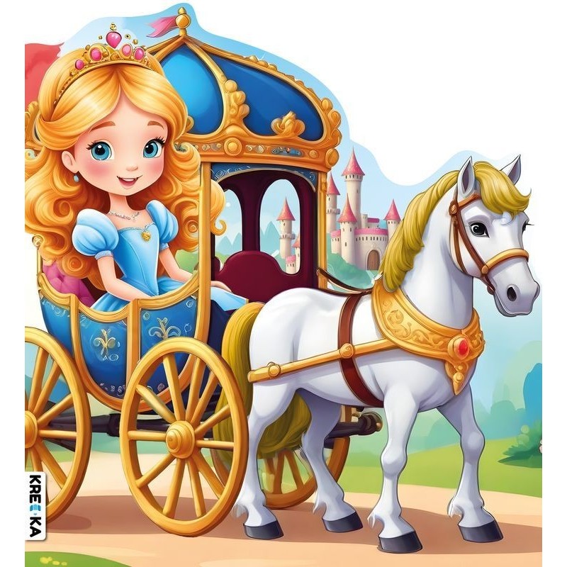 Kolorowanka z naklejkami skrojona na kształt karety z księżniczką. Rewelacyjna zabawa i uczta dla oczu malucha.