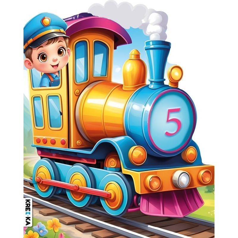 Kolorowanka z naklejkami skrojona na kształt lokomotywy z maszynistą. Rewelacyjna zabawa i uczta dla oczu malucha.