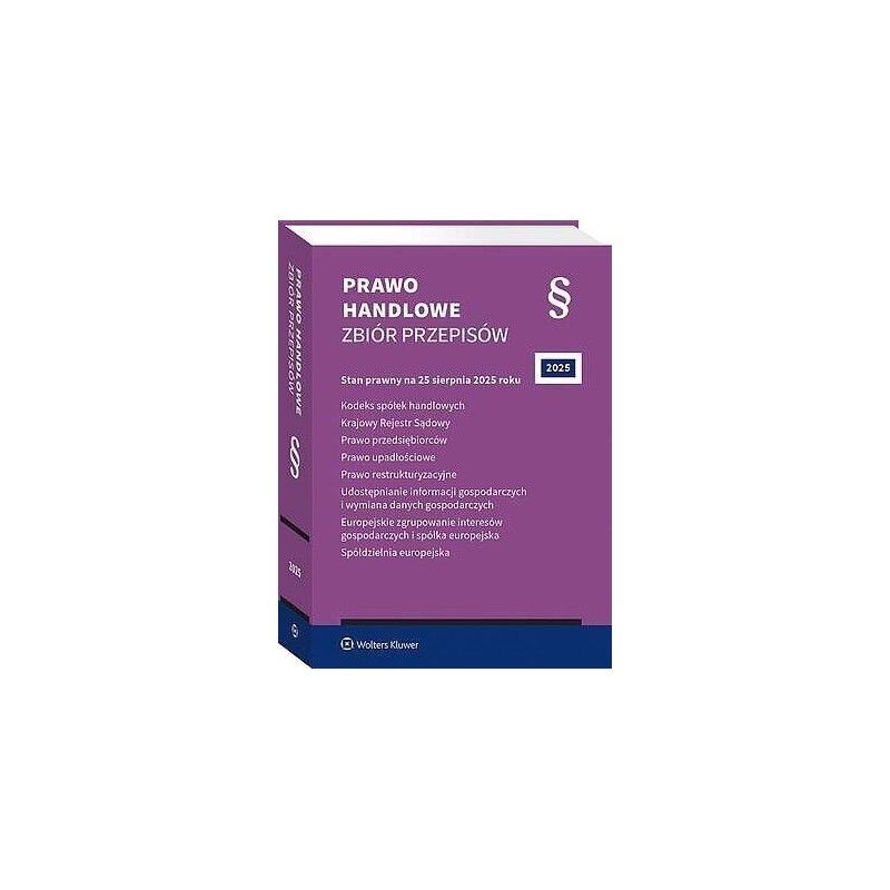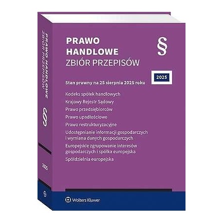 Praktyczny zbiór najważniejszych aktów prawnych z zakresu prawa handlowego. Zawiera informacje o uwzględnionych zmianach. Zastosowany system oznaczania nowych przepisów znacznie ułatwia codzienną pracę prawnika. Skorowidze do ustaw i tytuliki towarzyszące poszczególnym artykułom, przejrzysty układ, wygodny format, miękka oprawa ze skrzydełkami mogącymi posłużyć za zakładki to dodatkowe atuty książki. ,KRAJOWY REJESTR SĄDOWY:1 kwietnia 2025 r. , – , ustawa z 6 grudnia 2024 r. o zmianie ustawy o rachunkowości, ustawy ,o biegłych rewidentach, firmach audytorskich oraz nadzorze publicznym ,oraz niektórych innych ustaw (Dz.U. poz. 1863 ze zm.)22 czerwca 2025 r. , – , ustawa z 12 kwietnia 2024 r. o zmianie ustawy o rachunkowości oraz niektórych innych ustaw (Dz.U. poz. 619 ze zm.)2 lipca 2025 r. , , – , obwieszczenie , Marszałka , Sejmu , Rzeczypospolitej , Polskiej , z , 26 , czerwca2025 r. w sprawie ogłoszenia jednolitego tekstu ustawy o Krajowym Rejestrze Sądowym (Dz.U. poz. 869)PRAWO PRZEDSIĘBIORCÓW:19 marca 2025 r. , , – , ustawa z 6 grudnia 2024 r. o zmianie ustawy – Kodeks pracy oraz niektórych innych ustaw (Dz.U. poz. 1871)1 czerwca 2025 r. , , – , ustawa z 20 marca 2025 r. o warunkach dopuszczalności powierzania pracy cudzoziemcom na terytorium Rzeczypospolitej Polskiej (Dz.U. poz. 621)1 czerwca 2025 r. , , – , ustawa z 4 kwietnia 2025 r. o zmianie niektórych ustaw w celu wyeliminowania , nieprawidłowości , w , systemie , wizowym , Rzeczypospolitej , Polskiej ,(Dz.U. poz. 622)13 lipca 2025 r., 1 stycznia 2026 r. , – , ustawa z 21 maja 2025 r. o zmianie niektórych ustaw w celu ,deregulacji prawa gospodarczego i administracyjnego oraz doskonalenia ,zasad opracowywania prawa gospodarczego (Dz.U. poz. 769)1 stycznia 2026 r. , , – , ustawa z 25 lipca 2025 r. o zmianie niektórych ustaw w celu uproszczenia ,procedur , administracyjnych , oraz , wsparcia , przedsiębiorczości , (Dz.U.poz. 1168)PRAWO UPADŁOŚCIOWE:9 maja 2025 r. , – , obwieszczenie , Marszałka , Sejmu , Rzeczypospolitej , Polskiej , z , 24 , marca ,2025 r. w sprawie ogłoszenia jednolitego tekstu ustawy – Prawo upadłościowe (Dz.U. poz. 614)23 sierpnia 2025 r. , , – , ustawa z 25 lipca 2025 r. o zmianie ustawy – Prawo restrukturyzacyjne, ,ustawy – Prawo upadłościowe oraz ustawy o Krajowym Rejestrze Zadłużonych (Dz.U. poz. 1085)9 września 2025 r. , – , ustawa z 5 sierpnia 2025 r. o zmianie ustawy – Prawo bankowe oraz niektórych innych ustaw (Dz.U. poz. 1170)14 dni od dnia ogłoszenia – ustawa z 5 sierpnia 2025 r. o zmianie ustawy – Kodeks postępowania ,cywilnego, ustawy – Kodeks cywilny oraz niektórych innych ustaw (druk ,sejmowy nr 1304, ustawa oczekuje na publikację w Dzienniku Ustaw)UWZGLĘDNIA ZMIANY WCHODZĄCE W ŻYCIE Z DNIEM: PRAWO RESTRUKTURYZACYJNE:23 sierpnia 2025 r. , – , ustawa z 25 lipca 2025 r. o zmianie ustawy – Prawo restrukturyzacyjne, ,ustawy – Prawo upadłościowe oraz ustawy o Krajowym Rejestrze Zadłużonych (Dz.U. poz. 1085)9 września 2025 r. , – , ustawa z 5 sierpnia 2025 r. o zmianie ustawy – Prawo bankowe oraz niektórych innych ustaw (Dz.U. poz. 1170)14 dni od dnia ogłoszenia – ustawa z 5 sierpnia 2025 r. o zmianie ustawy – Kodeks postępowania ,cywilnego, ustawy – Kodeks cywilny oraz niektórych innych ustaw (druk ,sejmowy nr 1304, ustawa oczekuje na publikację w Dzienniku Ustaw)UDOSTĘPNIANIE INFORMACJI GOSPODARCZYCH ,I WYMIANA DANYCH GOSPODARCZYCH:22 stycznia 2025 r. , , – , obwieszczenie , Marszałka , Sejmu , Rzeczypospolitej , Polskiej , z , 15 , stycznia ,2025 r. w sprawie ogłoszenia jednolitego tekstu ustawy o udostępnianiu ,informacji gospodarczych i wymianie danych gospodarczych (Dz.U. poz. 85)1