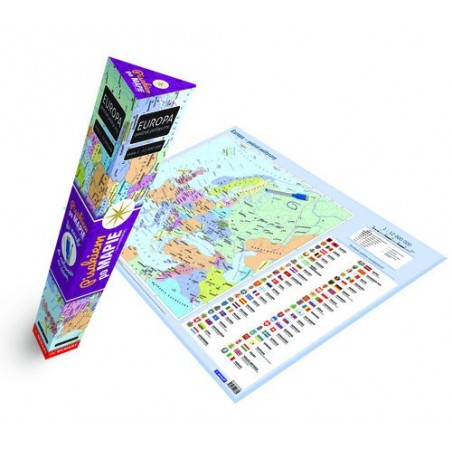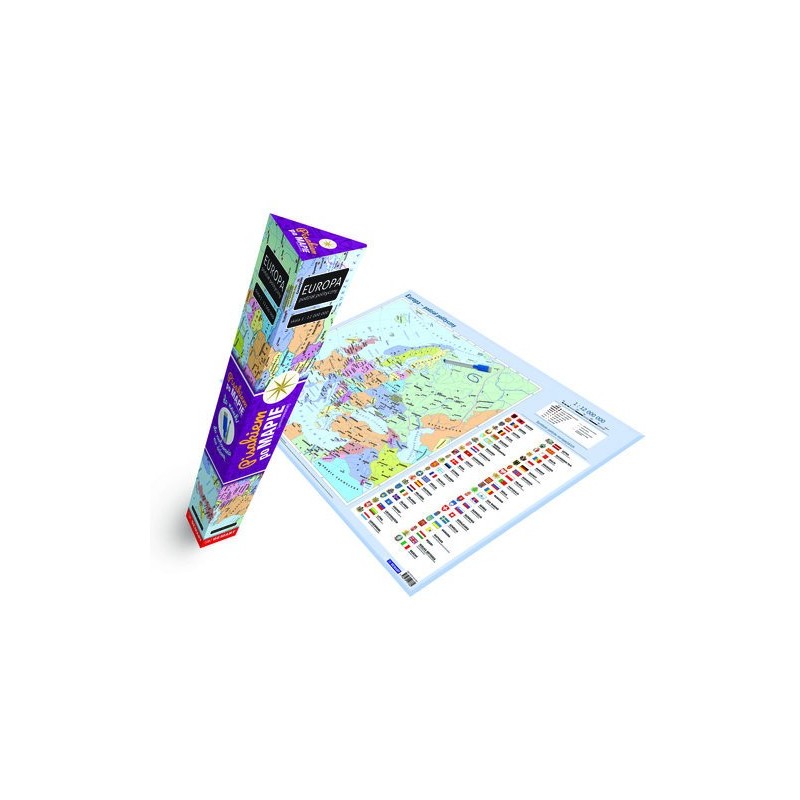 Mapie z podziałem politycznym Europy w skali 1 : 12 000 000 towarzyszą symbole wszystkich europejskich państw - flagi oraz herby. Mapa z taką treścią pomoże w opanowaniu nazw krajów i ich stolic, rozmieszczenia na kontynencie względem innych państw i dostępności – lub jej braku – do morza czy oceanu, zapamiętaniu sąsiedztwa i relacji wielkości powierzchni poszczególnych krajów. Na odwrocie znajduje się kolorowa mapa konturowa. Można ją uzupełniać własnymi podpisami przy pomocy dołączonego do zestawu pisaka suchościeralnego. Mapa dwustronna z kolorową mapą konturową