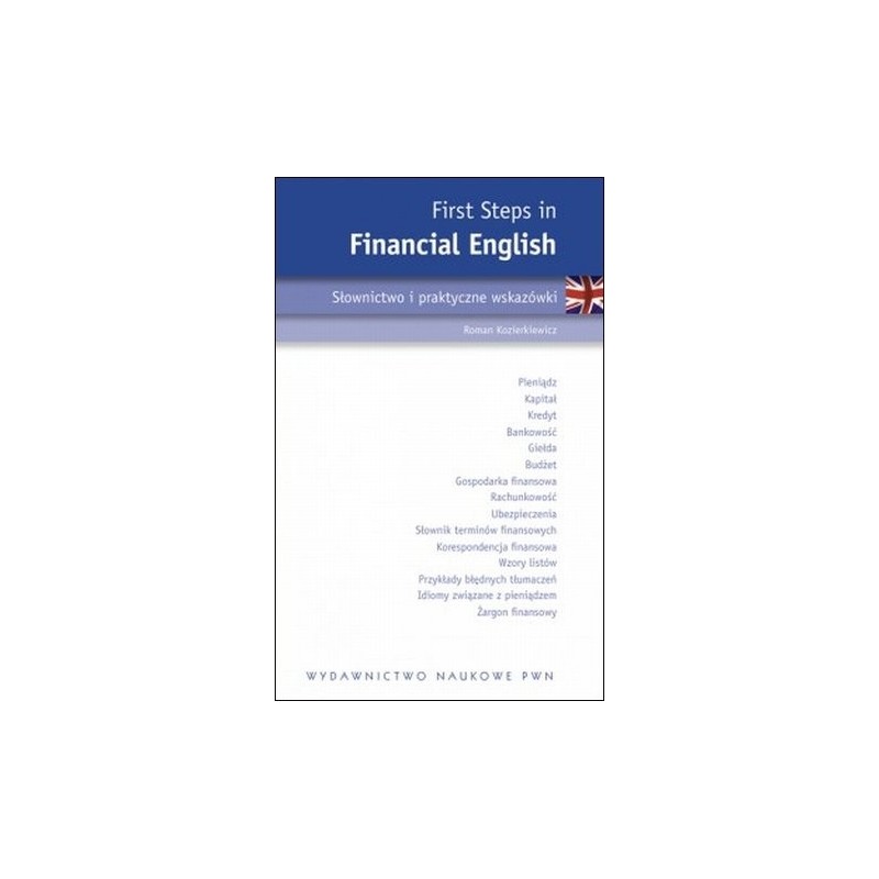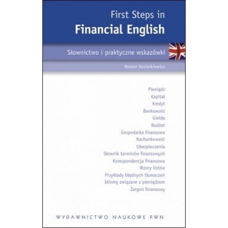 Książka `First Steps in Financial English` zawiera prezentację podstawowych zagadnień finansowych. W kolejnych rozdziałach przedstawiane są terminy finansowe w wersji polskiej i angielskiej. Jednocześnie dla utrwalenia terminów angielskich są one powtórzone po każdym rozdziale w postaci „kluczowych słów do zapamiętania” (key words to remember). Książka zawiera też rozdział poświęcony korespondencji finansowej, w którym Czytelnik znajdzie wybrane wzorów listów dotyczących spraw bankowych, udzielania kredytów i innych. Kolejne rozdziały omawiają żargon finansowy i idiomy związane z tematyką Financial English. Gdy przeglądamy brytyjską czy amerykańską prasę finansową, napotykamy bardzo często zwroty idiomatyczne, które niekiedy mogą sprawiać trudności nawet osobom dobrze znającym język angielski. Podobnie jak w innych dziedzinach, w Financial English spotykamy też typowy żargon finansowy, który dla osób niewtajemniczonych w arkana finansów może być przeszkodą nie do pokonania. Osobny rozdział zatytułowany „Jak tłumaczyć teksty finansowe?” został poświęcony tłumaczeniom, zawiera cenne wskazówki językowe, a także przykłady błędnych tłumaczeń. Obszerną część książki stanowi angielsko-polski słownik finansowy, który liczy blisko 2000 haseł.