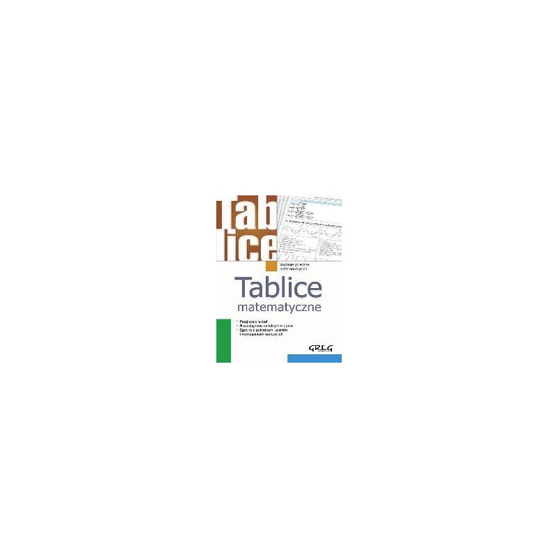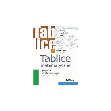 Tablice matematyczne to zbiór wszystkich wzorów, z których uczeń korzysta nie tylko na lekcjach matematyki, ale także w domu. Nie trzeba już szukać po różnych książkach poszczególnych informacji. Teraz wszystkie one znajdują się w naszych tablicach. Zawierają one także wykresy, regułki czyli wszystko to, co jest niezbędne do zrozumienia poszczególnych zagadnień z matematyki. Spis treści  , Alfabet grecki, wybrane stałe, nazwy liczb Cyfry i liczby rzymskie, jednostki podstawowe Wybrane własności liczb Działania arytmetyczne Ułamki, proporcjonalność, proporcje Podstawowe pojęcia algebry Dwumian Newtona Tablica pierwiastków kwadratowych Tablica pierwiastków sześciennych (2, 0) Podstawowe typy równań Postaci trójmianu kwadratowego Wielomiany Układy równań liniowych Logarytm: definicje i własności Tablica logarytmów naturalnych Tablica logarytmów dziesiętnych (1, 0) Funkcje trygonometryczne dowolnego kąta Wykresy funkcji trygonometrycznych Tablice funkcji trygonometrycznych Funkcje cyklometryczne Ciąg arytmetyczny i geometryczny Średnie Granica ciągu Pojęcie funkcji Granica funkcji w punkcie Badanie przebiegu zmienności funkcji Wybrane własności funkcji Funkcje: liniowa, kwadratowa i homograficzna Funkcje: wartość bezwzględna, signum, E(x) Monotoniczność funkcji Rachunek różniczkowy Pochodne funkcji elementarnych Rachunek całkowy Całki funkcji elementarnych Elementarne przekształcenia funkcji Macierze i wyznaczniki Podstawowe twierdzenia geometrii Podstawy geometrii Kąty w różnym ujęciu Wybrane przekształcenia geometryczne Prosta Płaszczyzna Trójkąty Czworokąty Klasyfikacja wielokątów Okrąg Koło i jego części Bryły Krzywe drugiego stopnia Wektory Działania na zbiorach Elementy logiki Rachunek zdań a rachunek zbiorów - analogie Elementy kombinatoryki Rachunek prawdopodobieństwa